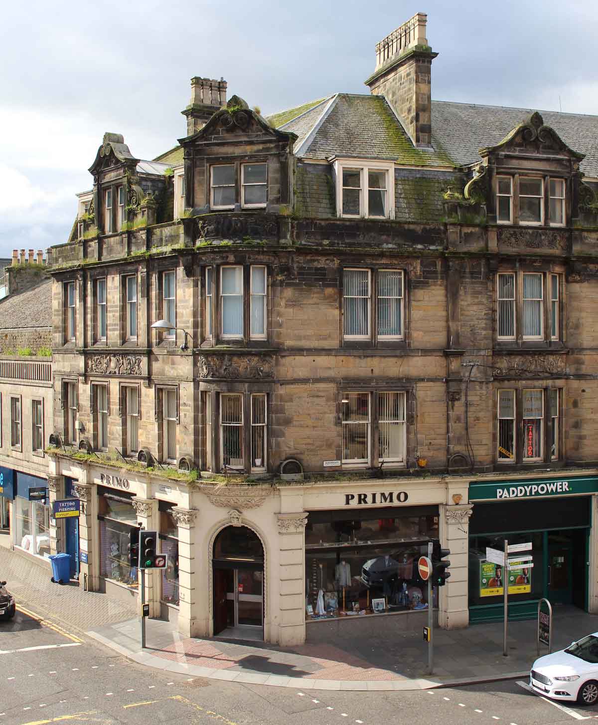 This commercial block on the corner of Academy Street and Queensgate, in the centre of Inverness was designed by Alexander Ross in 1895.
